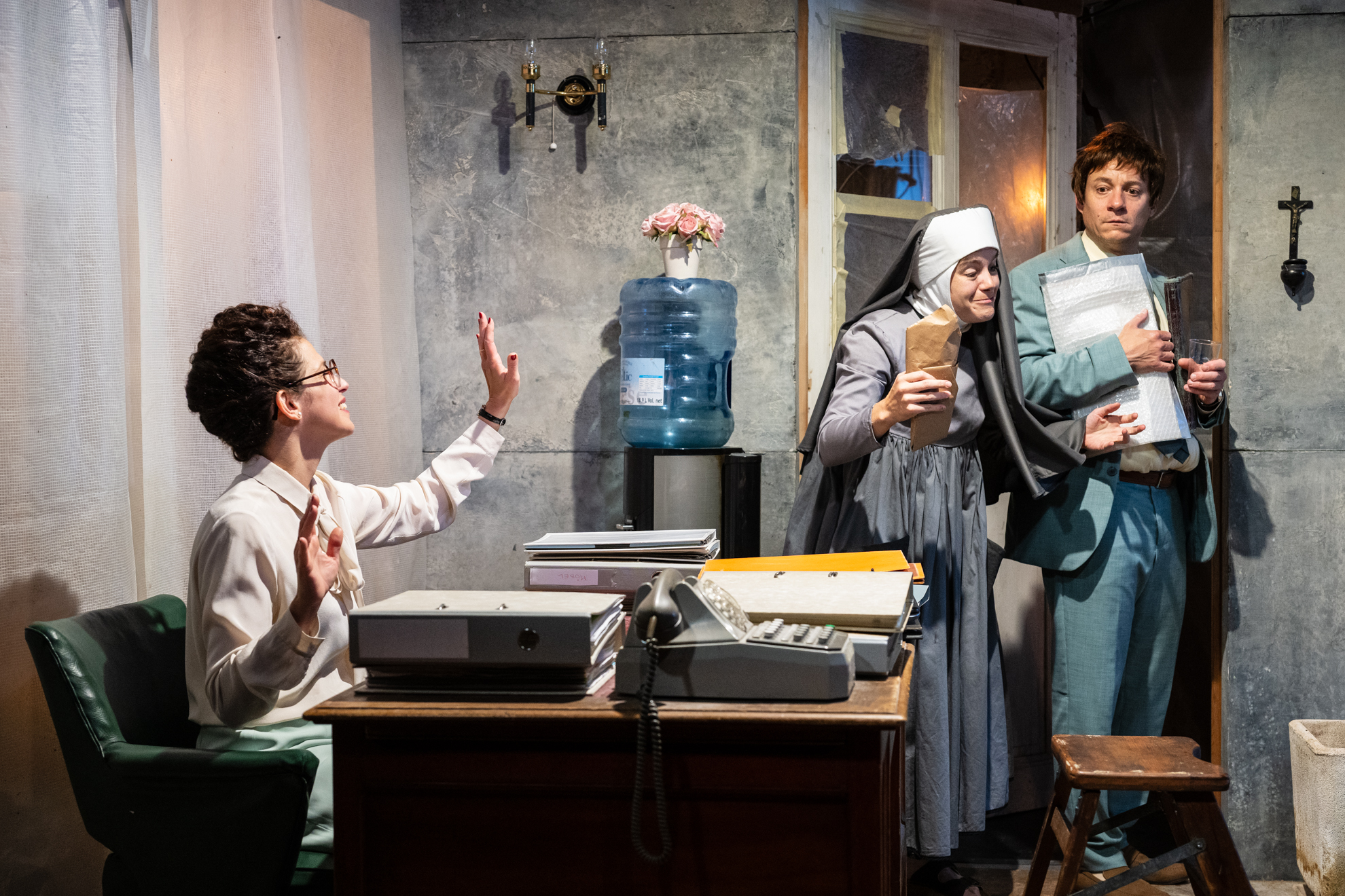 Si la vie politique ressemble parfois étrangement à une farce, c’est aussi ce mode théâtral qu’utilise Eduardo De Filippo pour parler des liens subtils unissant cette sphère à celle du monde culturel. Ainsi quand arrive Oreste Campese, un chef de troupe dont la roulotte vient tout juste de partir en fumée, il se confronte à Madame De Caro qui, elle, entre à peine dans ses nouvelles fonctions de Préfète.